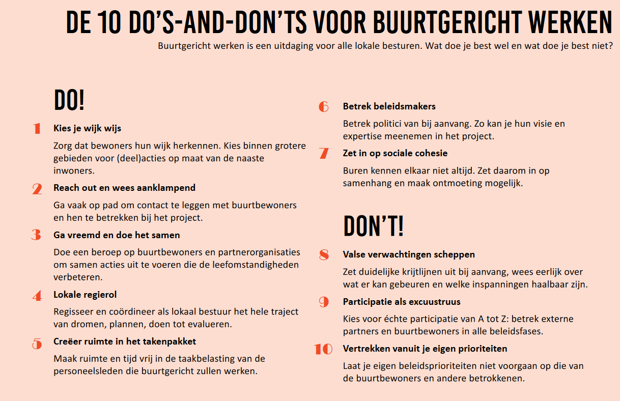 “Ga vreemd en doe het samen.” Dat is één van de opvallende tips uit de Do’s and Don’ts lijst voor buurtgericht werken. Een lijstje van 10 vuistregels die je terugvindt in de eindrapporten van het project buurtgerichte zorg in Balen en Ravels. Het zijn geen relatietips, maar wel aanbevelingen vanwege CEBUD. Het CEntrum voor BUDgetadvies en –onderzoek van Thomas More geeft hiermee richting en advies aan lokale besturen die met een kwetsbare buurt aan de slag willen gaan. Deze tip betekent: ‘Ga naar de buurt toe en doe een beroep op bewoners en partnerorganisaties om buurtgerichte acties uit te voeren.’